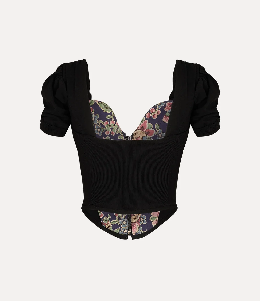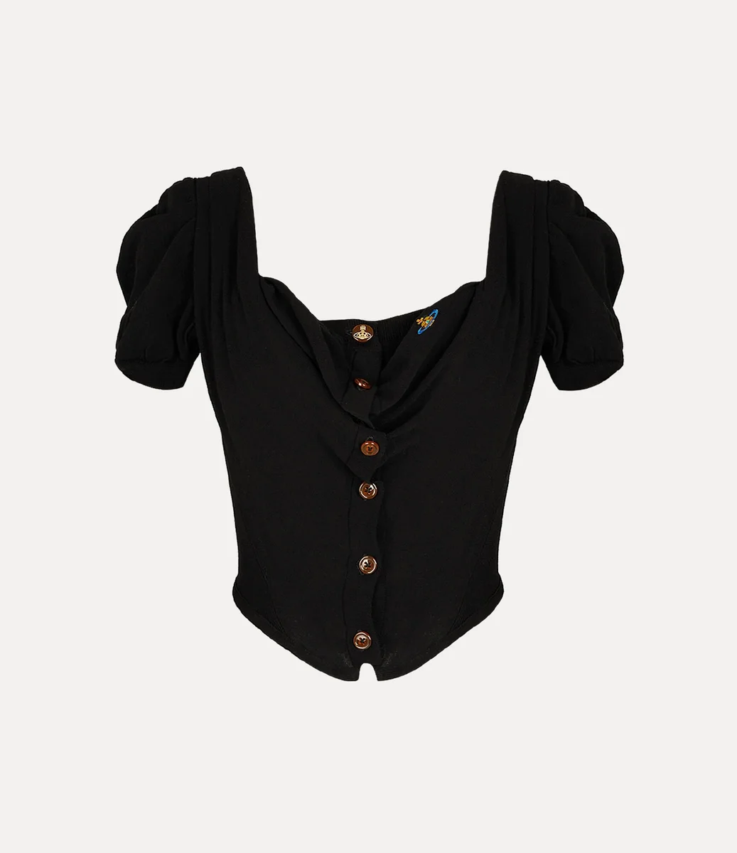 Cardiganul Bea Corset cu mâneci scurte are drapaje delicate la decolteu și umeri, care cad într-un corset structurat cu balene, închizându-se cu nasturii noștri clasici de culoare chihlimbar. Designul este împodobit cu un glob brodat multicolor pe piept, care întruchipează viziunea Viviennei de a lansa tradiția în viitor.