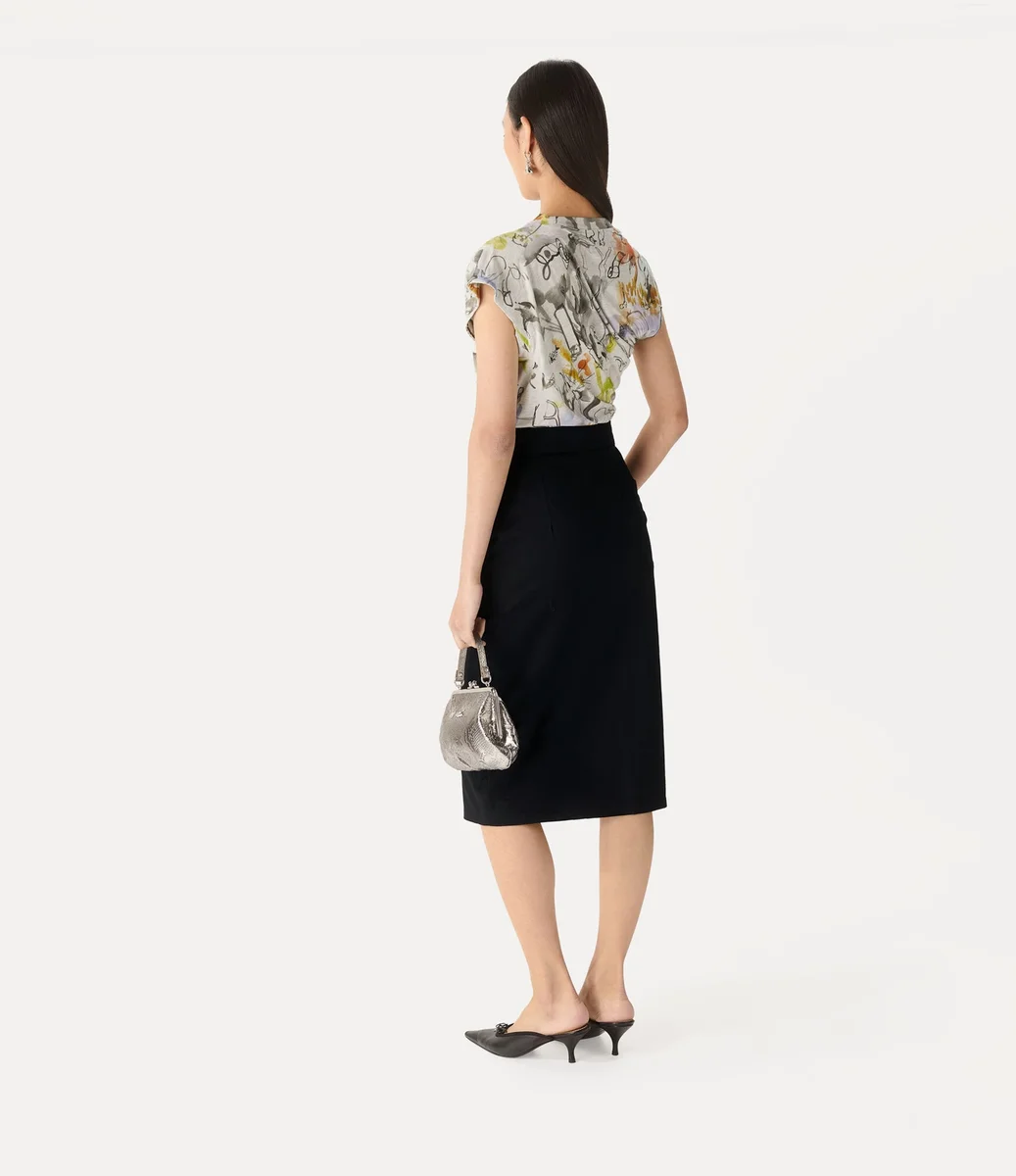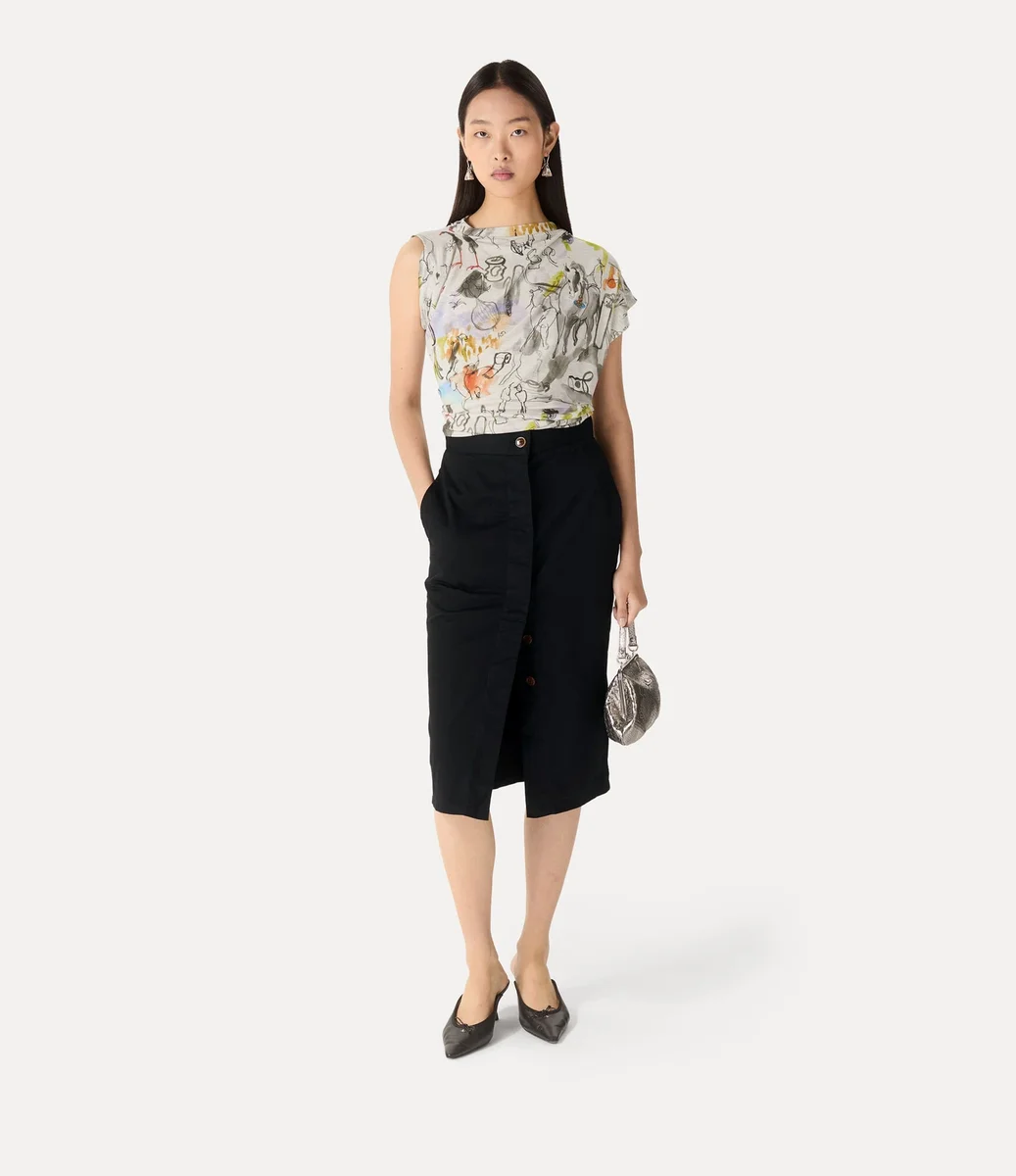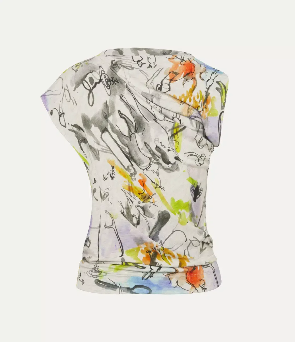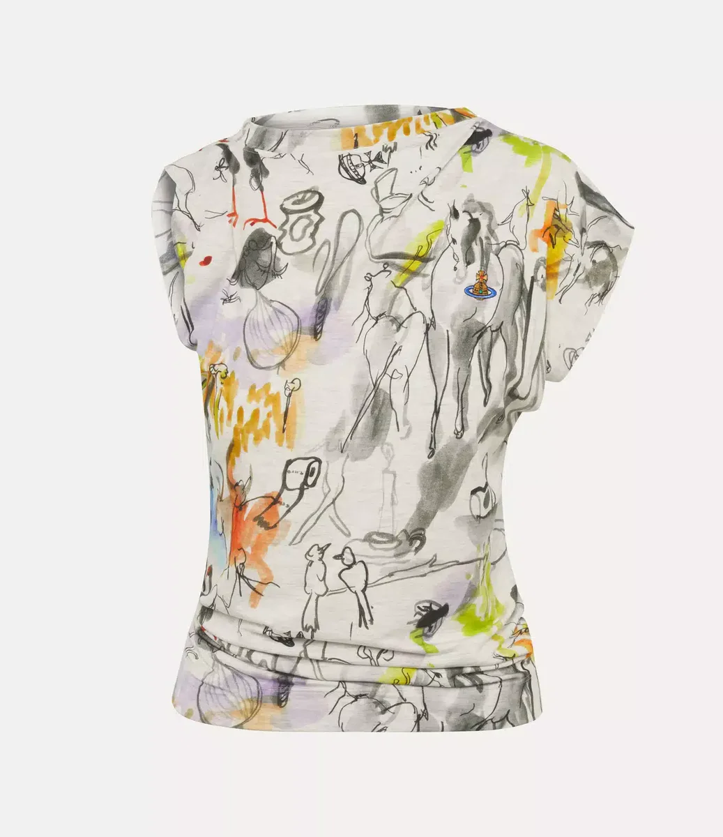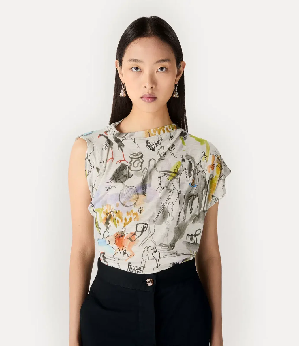 Topul nostru emblematic Hebo este confecționat dintr-un amestec moale de bumbac și imprimat cu grafica „Wonderland” a acestui sezon, completată cu o serie de motive complexe desenate manual, suprapuse cu pete de acuarelă în tonuri vibrante. Brodat cu un motiv multicolor în formă de glob, articolul amintește de viziunea Viviennei de a lansa tradiția în viitor.