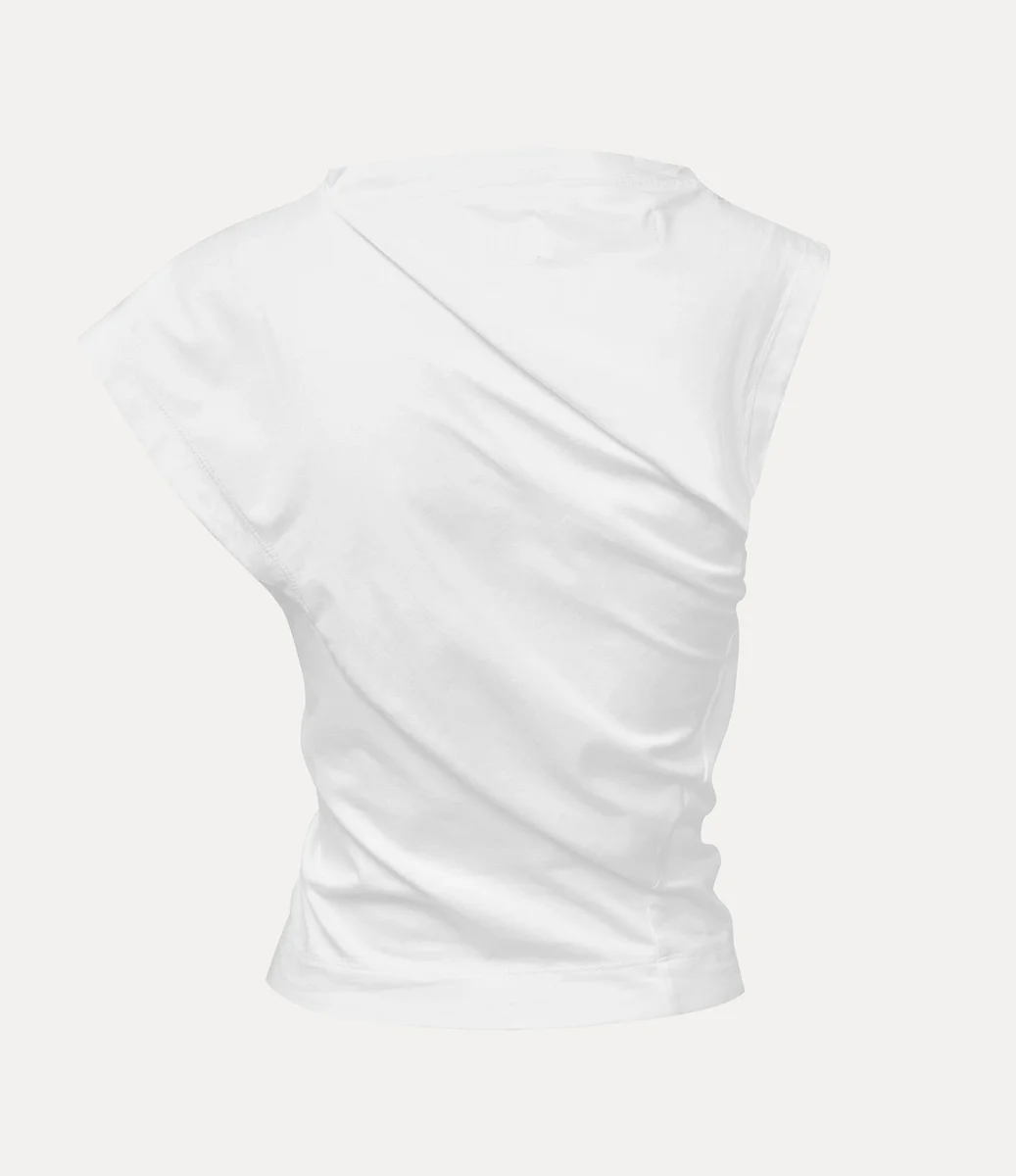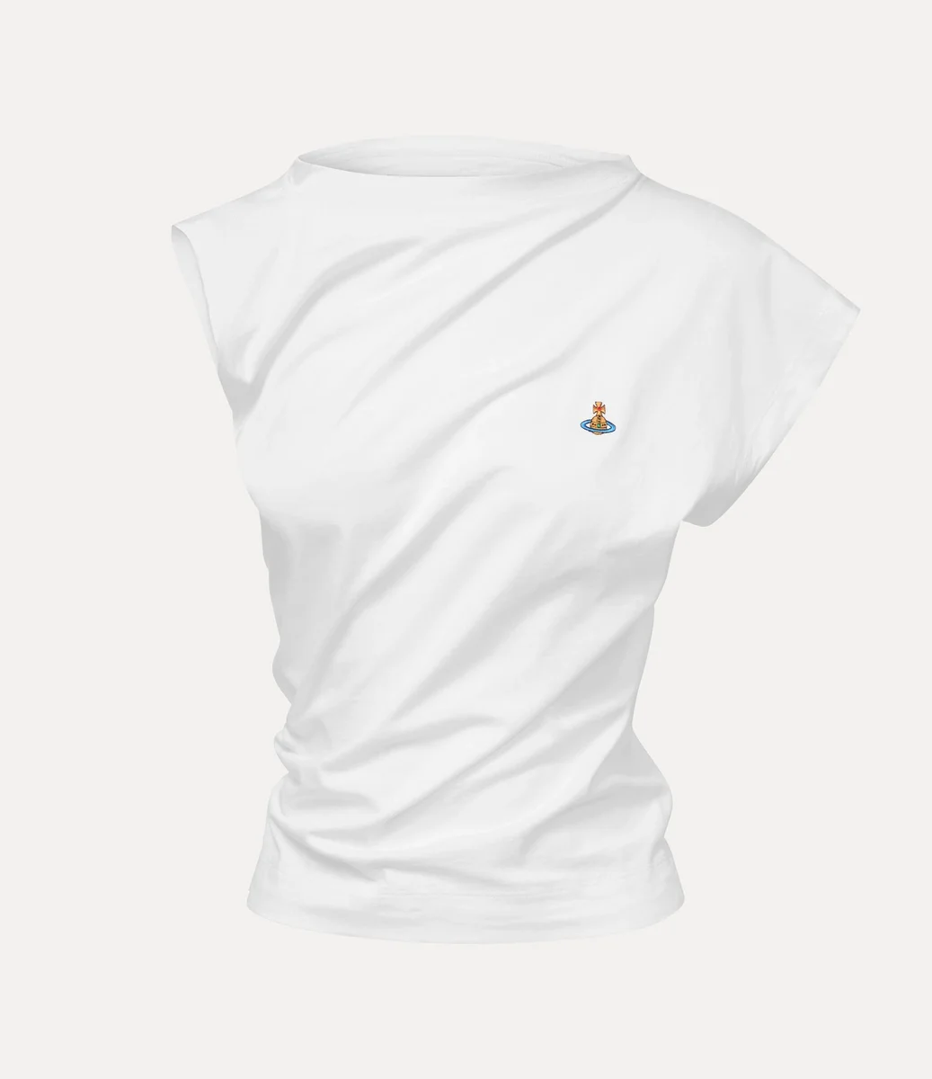 Topul Hebo, semnătura casei, a fost actualizat, prezentând în acest sezon un finisaj moale din bumbac și o broderie orb pe partea stângă a pieptului – sinonimă cu viziunea Viviennei de a lansa tradiția în viitor. Silueta încorporează decolteul inspirat de tăietura caracteristică Viviennei, detalii drapate și țesătură răsucită în partea din spate a designului.