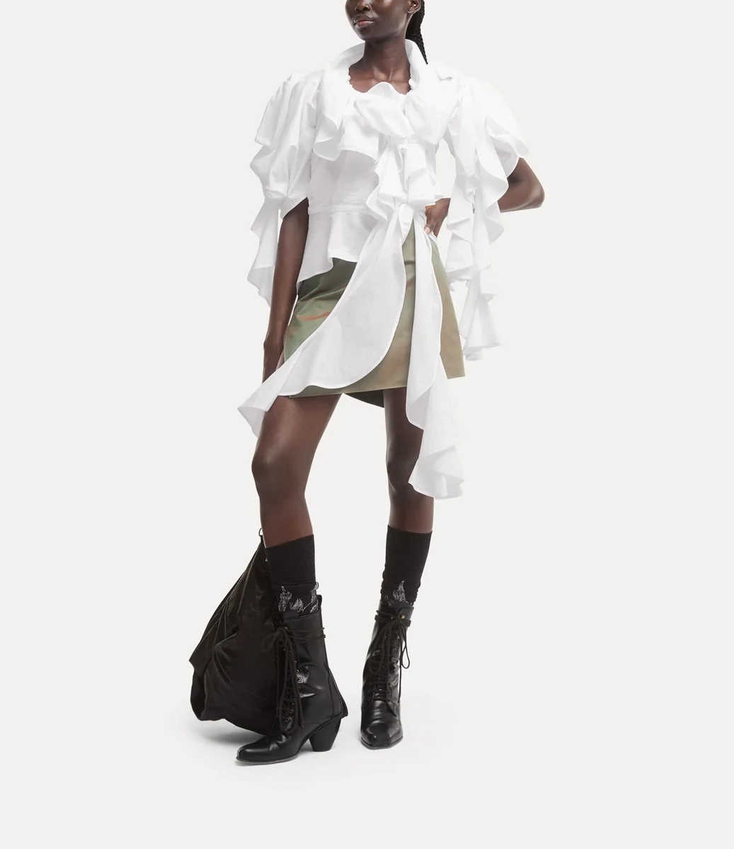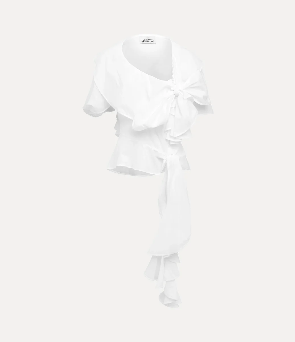 Topul nostru Lola Ruffle cade peste corp cu o asimetrie deliberată pentru a crea o siluetă voluminoasă, finisată cu motivele caracteristice ale casei, în formă de fundă, care se transformă în detalii ample cu volane. Strâns în talie, articolul este încadrat de un decolteu romantic și mâneci ușor bufante.