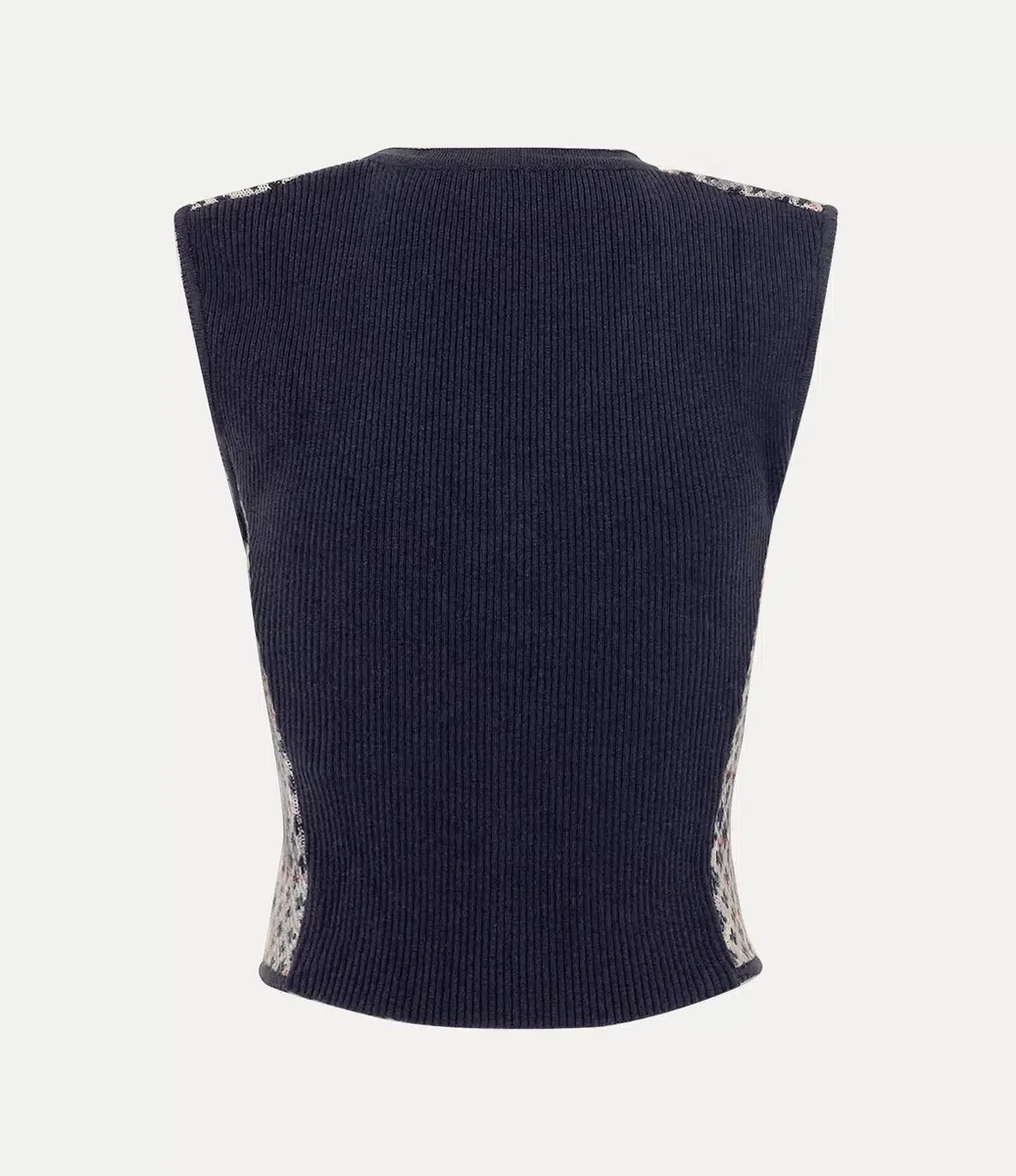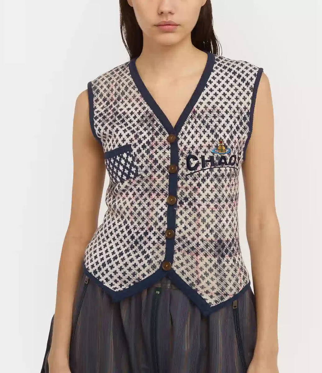 Confecționată dintr-un amestec moale de bumbac și lână, vesta noastră Distressed Tartan are un model argyle jacquard Crosses, suprapus cu un imprimeu tartan „Distressed”. Concepută cu decolteu în V și finisată cu un rând de nasturi în față, piesa este brodată cu un motiv orb și motivul iconic „CHAOS”.
