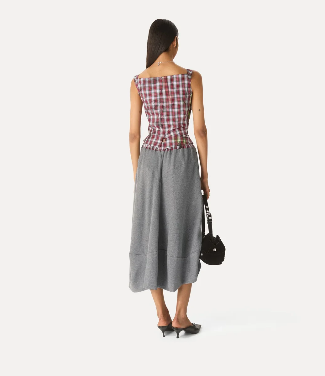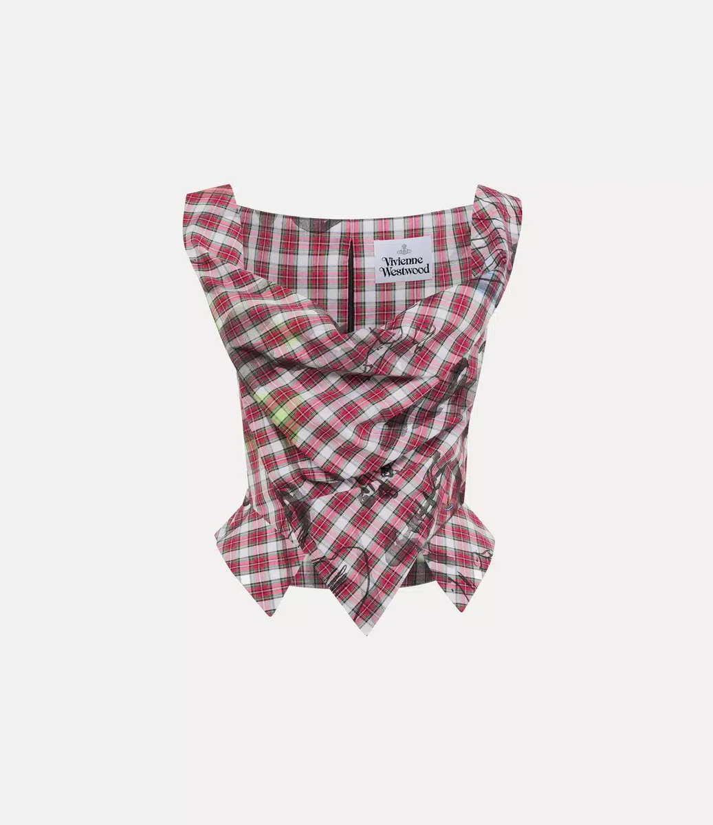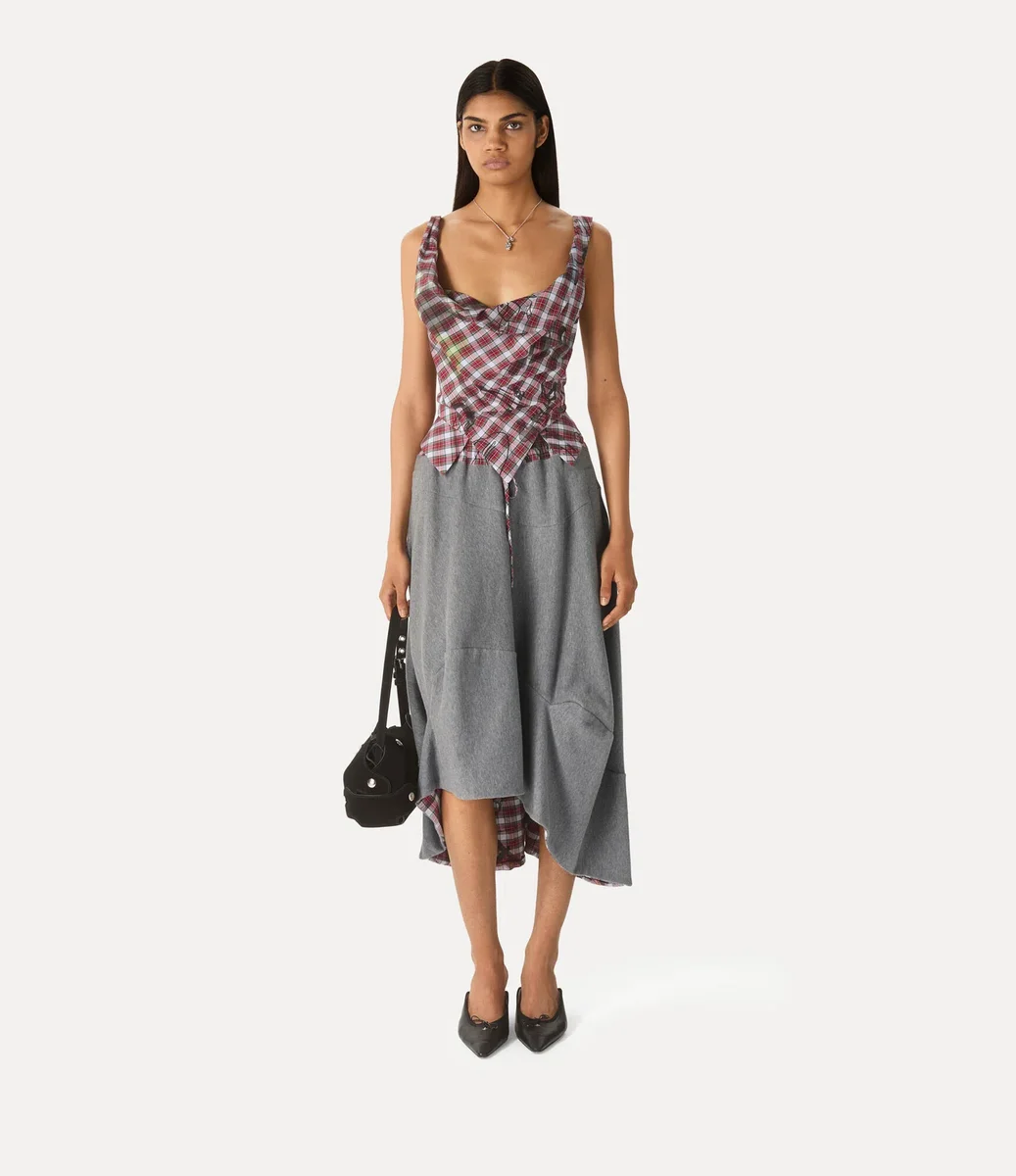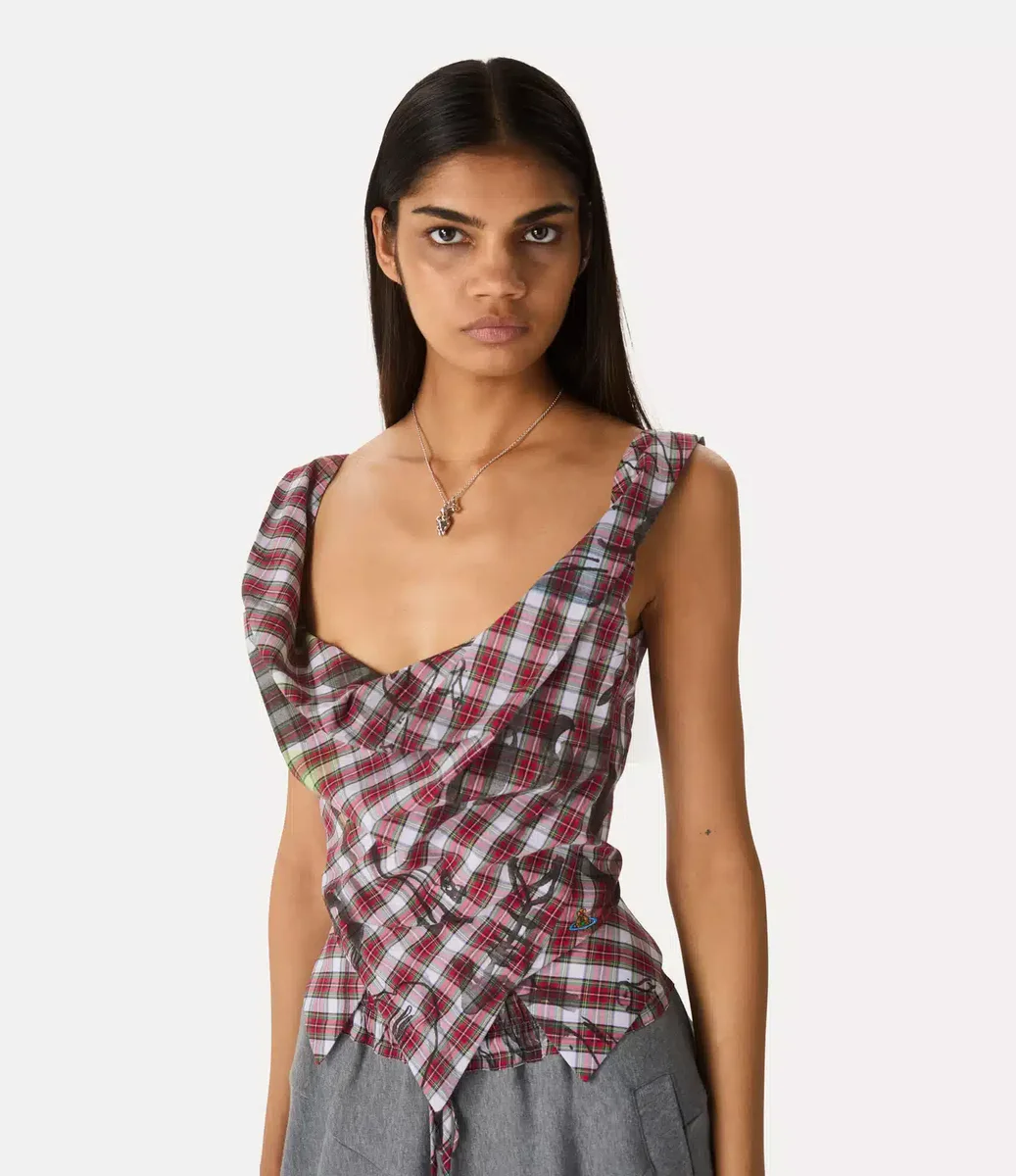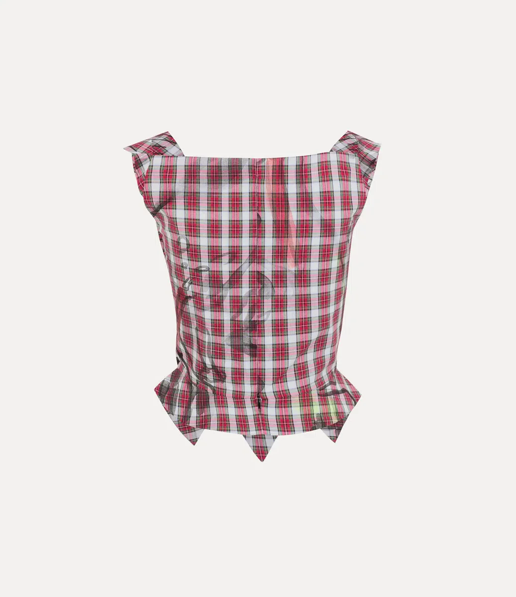 În acest sezon, topul nostru Sunday este croit într-un motiv tartan roșu imprimat, evocând o estetică clasică, artizanală. Suprapus cu ilustrații imprimate desenate manual de Dominic Myatt și accentuat cu spray-uri graffiti vibrante, designul aduce un omagiu spiritului punk „DIY” al casei.