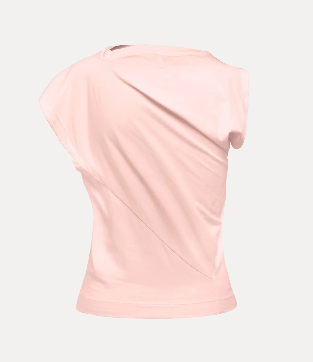 Topul Hebo, semnătura casei de modă, a fost actualizat, prezentând în acest sezon un finisaj din bumbac moale și o broderie orb pe partea stângă a pieptului – sinonimă cu viziunea Viviennei de a lansa tradiția în viitor. Silueta încorporează decolteul inspirat de tăieturi, detaliile drapate și țesătura răsucită din spatele designului, semnătura Viviennei.