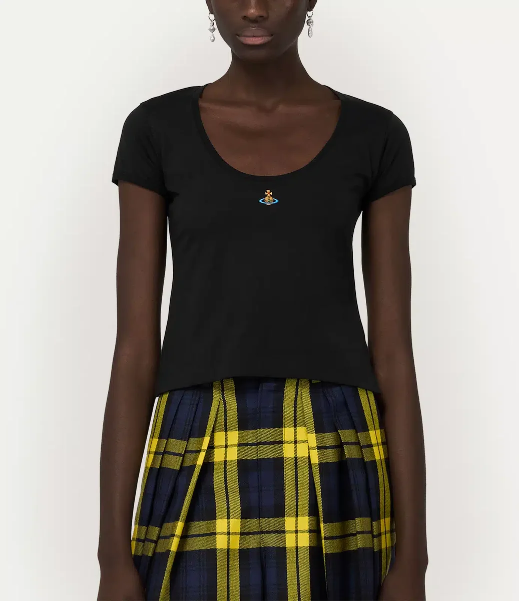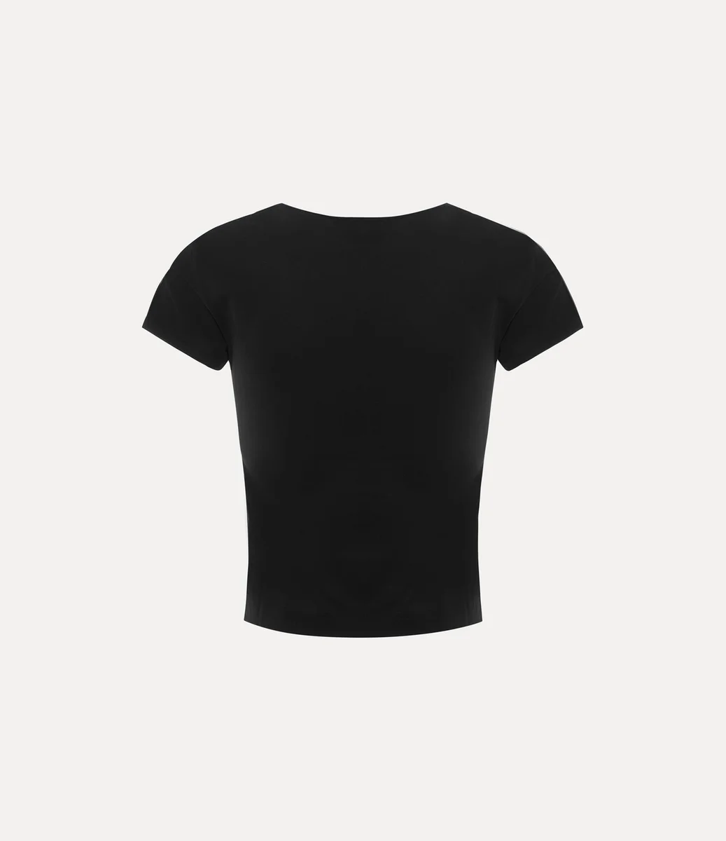 Tricoul nostru Micro Lollo are o croială scurtă din bumbac, cu mâneci scurte și decolteu rotund. Piesa are o broderie multicoloră în formă de glob în centrul pieptului, care simbolizează tradiția, înconjurată de inelele celeste ale lui Saturn, reprezentând viitorul.