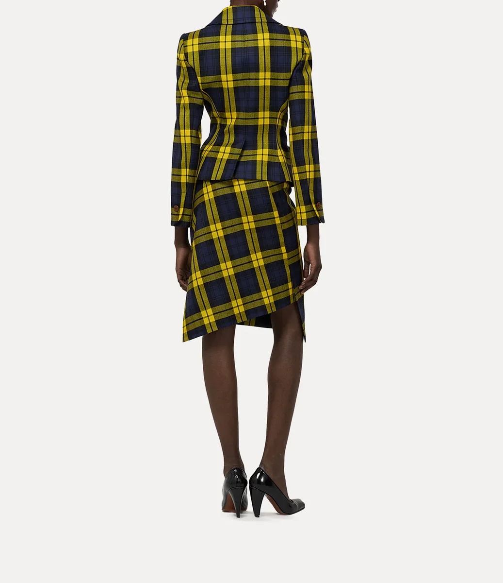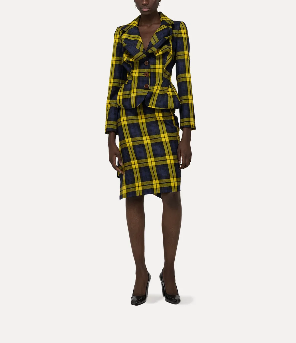 Jacheta Drunken utilizează sistemul original experimental de croială al Viviennei, în care elementele articolului vestimentar sunt distorsionate, luând o formă aproape suprarealistă. Articolul este realizat din lână tartan „Moonshine” din această sezon, completat cu nuanțe vibrante și un design cu nasturi în față.