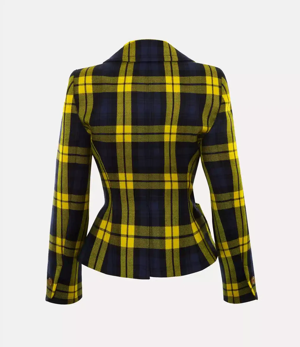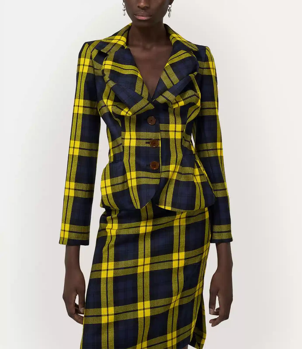 Jacheta Vivienne Westwood Drunken oferă tartanul din lână „Moonshine” al acestui sezon, completat cu nuanțe vibrante și un design cu nasturi în față.