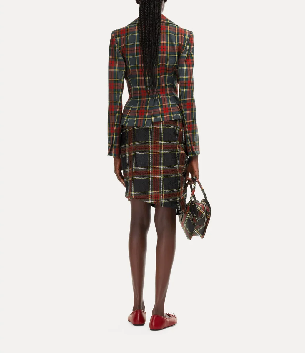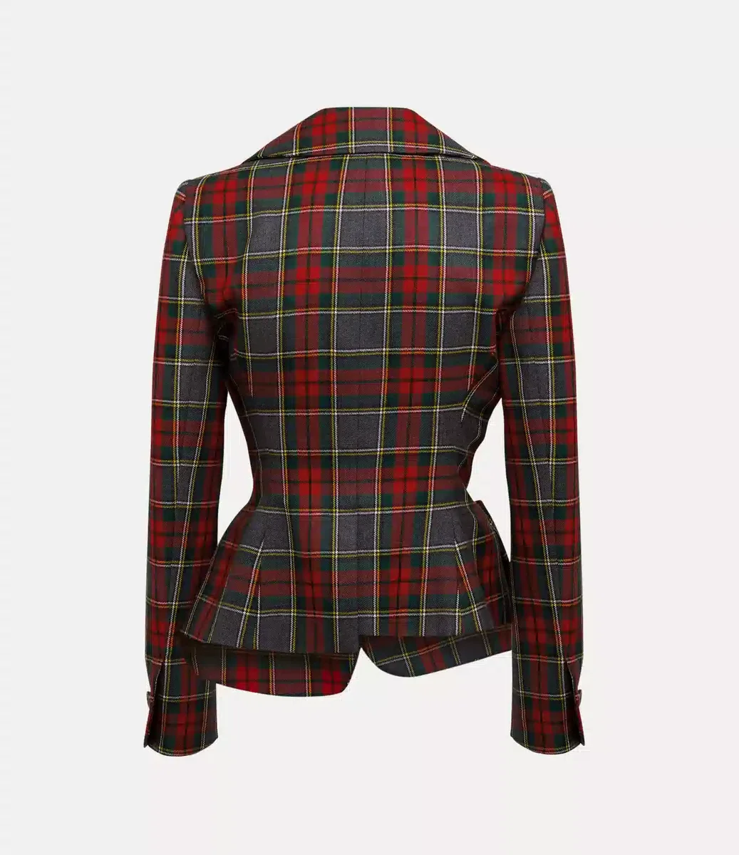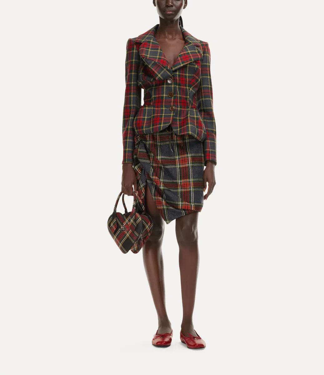 Jacheta noastră Drunken utilizează sistemul original experimental de croială al Vivienne, în care elementele vestimentare sunt distorsionate, luând o formă aproape suprarealistă. Piesa este disponibilă în acest sezon în tartanul vibrant „Scarlet” și are închidere cu nasturi în față.