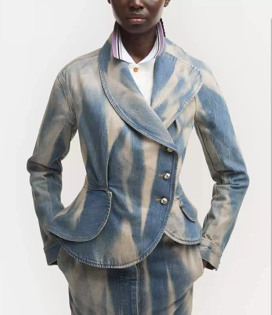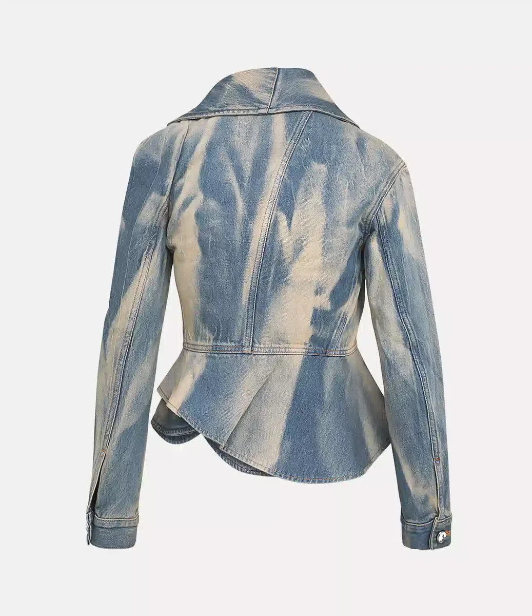 Confecționată din bumbac moale, jacheta noastră Stormy Denim are o spălare decolorată, care îi conferă un finisaj vintage, cu aspect uzat. Designul este definit de reverul asimetric exagerat, care conferă o notă sculpturală decolteului, în timp ce talia conturată și tivul evazat creează o siluetă definită, croită pe măsură.