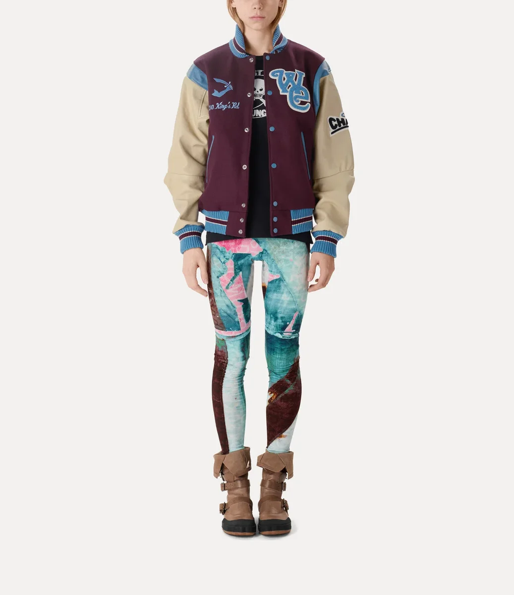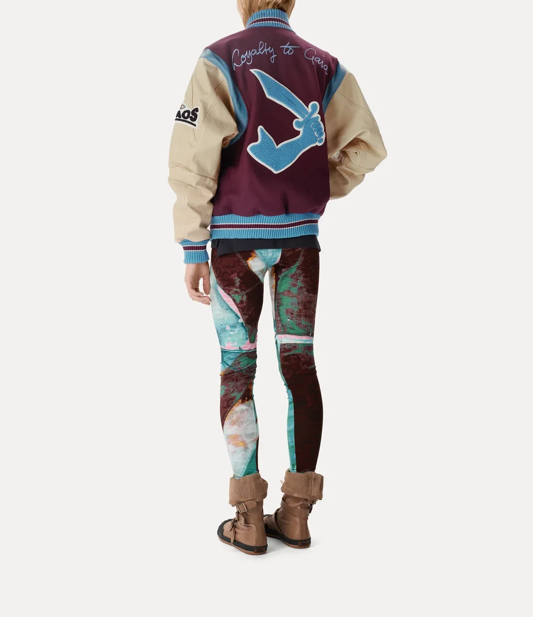 Jacheta noastră Worlds End Letterman are o siluetă inspirată de jacheta bomber, cu mâneci din piele și borduri contrastante cu nervuri. Partea din față este decorată cu un motiv reprezentând un braț și o sabie și adresa boutique-ului nostru Worlds End, iar pe spate este inscripționată fraza „Loyalty to Gaia” (Loialitate față de Gaia) – o referință la angajamentul Viviennei față de activismul climatic.