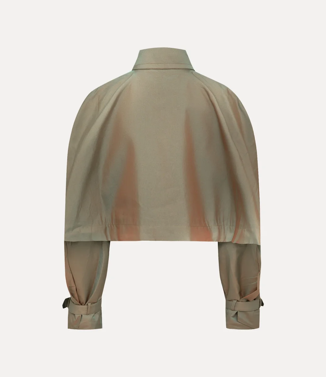 Paltonul nostru Cut Off Graziano Trench este reimaginat într-un finisaj în două nuanțe, completat cu o spălare moale verde-maro care oferă un efect irizat, uzat. Croit într-o siluetă voluminoasă, designul se inspiră din sistemul de croitorie „Cloud” din arhivă, introdus pentru prima dată în colecția Andreas Kronthaler pentru Vivienne Westwood Toamnă-Iarnă 2022.