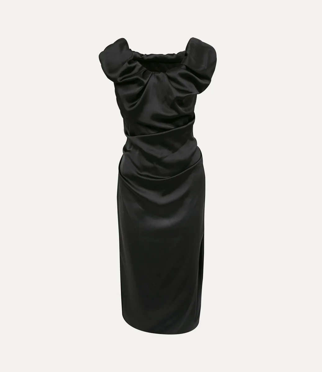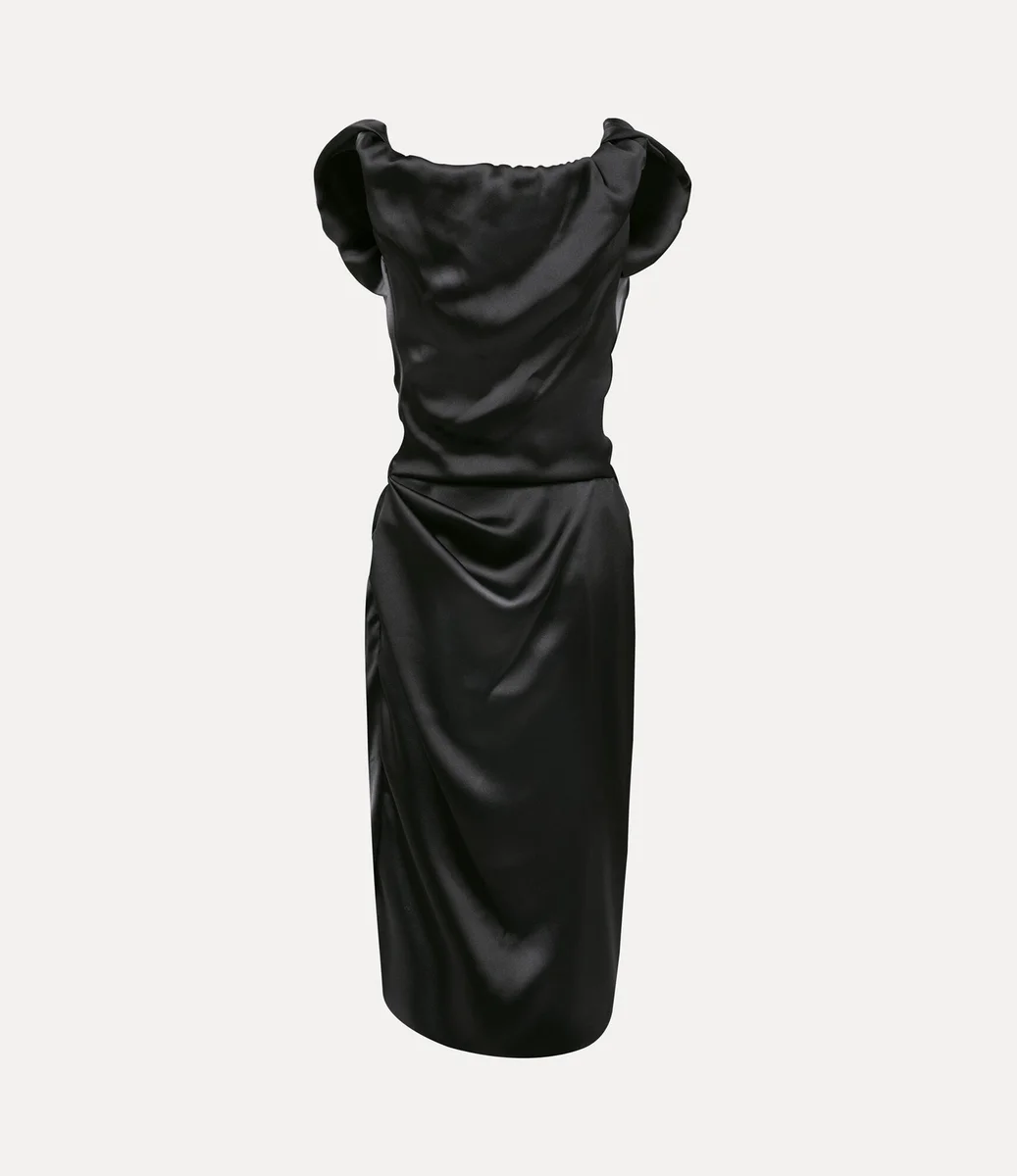 Rochia noastră atemporală Ginnie Amber este reinterpretată în acest sezon într-o finisare luxoasă din satin. Concepută cu un decolteu asimetric cu volane, piesa este drapată ușor pe corset și șolduri, înainte de a cădea într-o siluetă rafinată de lungime medie.