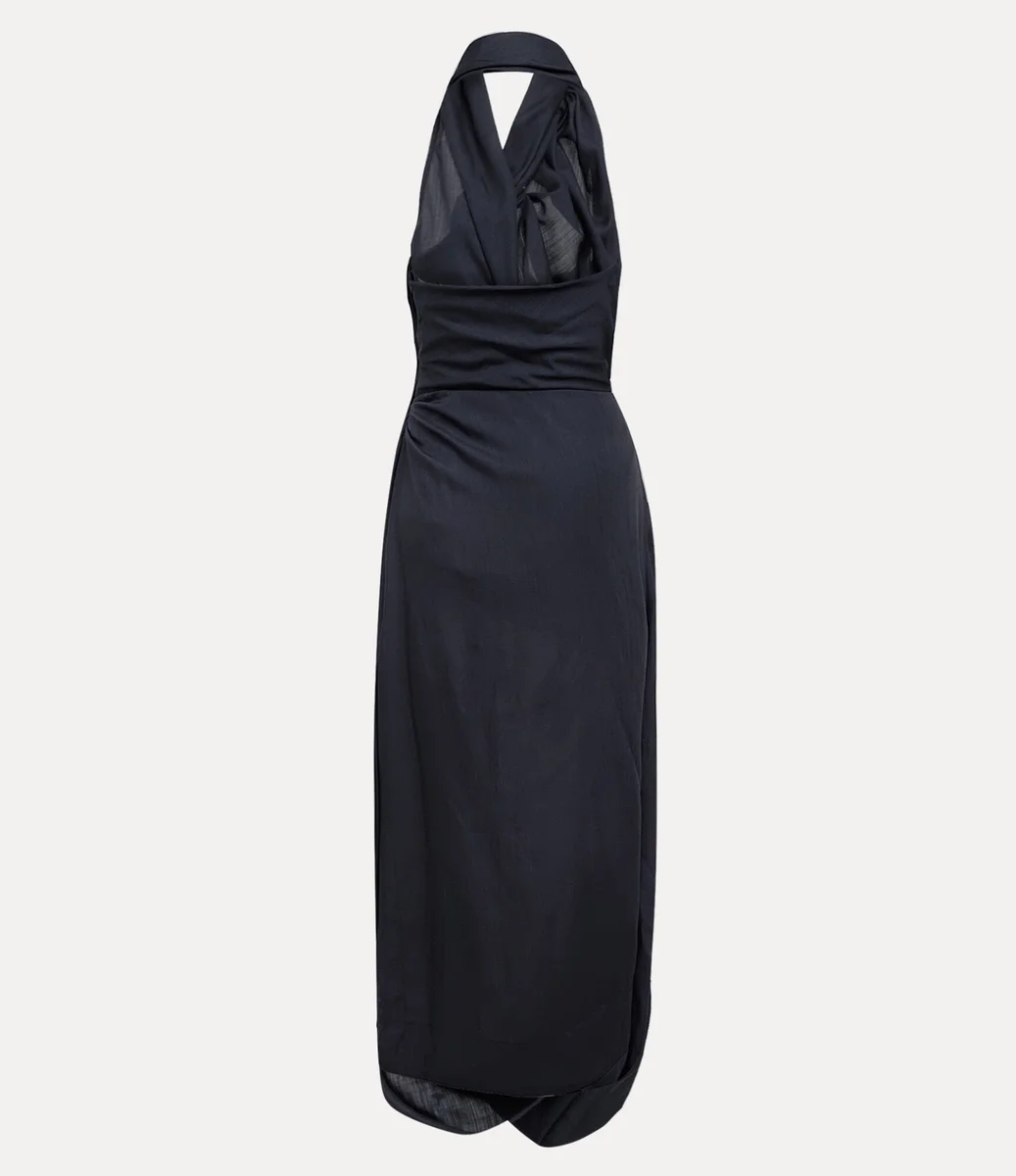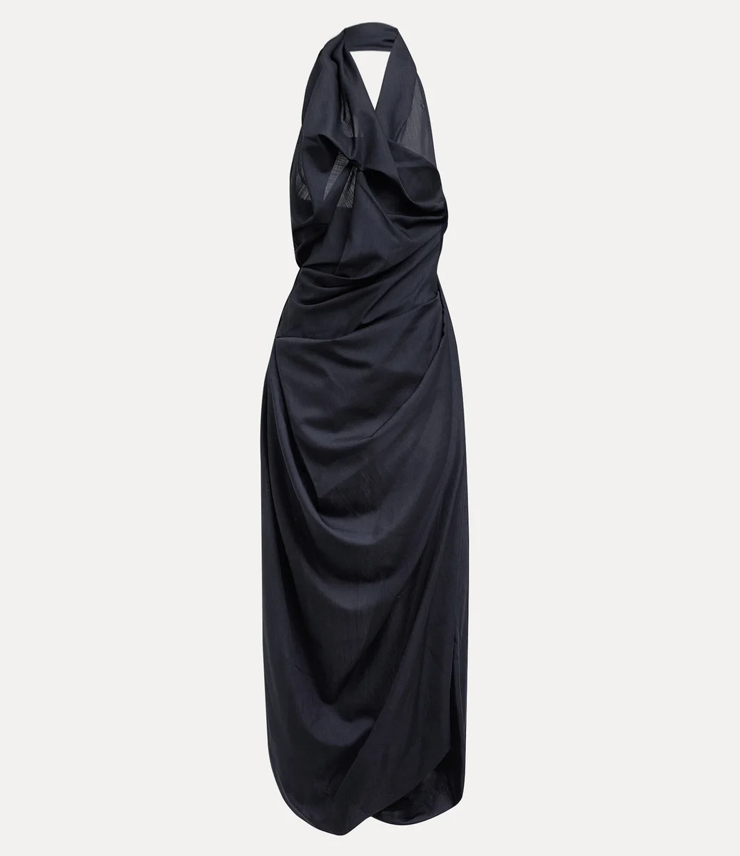 Rochia noastră Halter Galatea se înfășoară în jurul corpului în straturi delicate de lână ușoară și transparentă, finisată cu cusături răsucite complexe pentru un efect asimetric. Decolteul rafinat în formă de halter cade în pliuri adânci, strângându-se la talie înainte de a se revărsa într-o fustă grațioasă în formă de coloană.