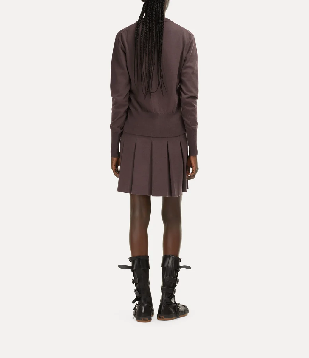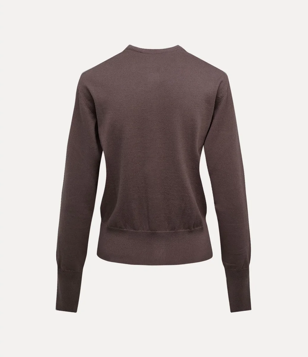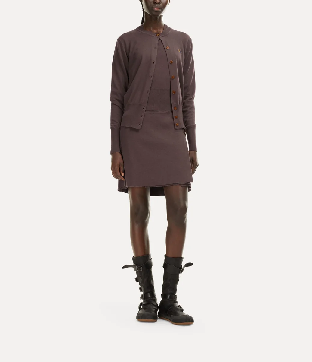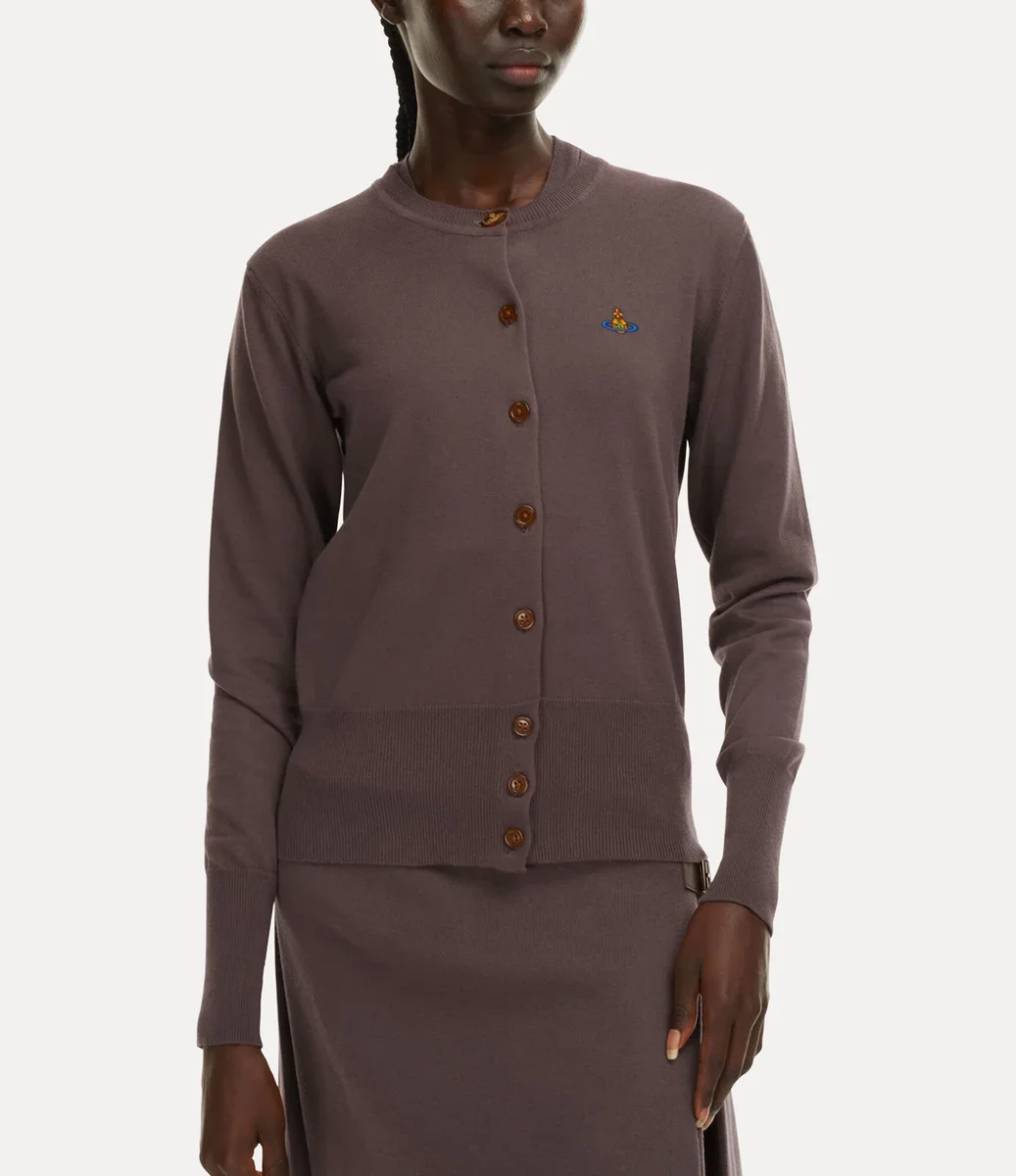 Cardiganul Bea de la Vivienne Westwood, dintr-un amestec de bumbac și cașmir, are guler rotund și croială ajustată, fiind completat de nasturi de chihlimbar și un glob brodat.