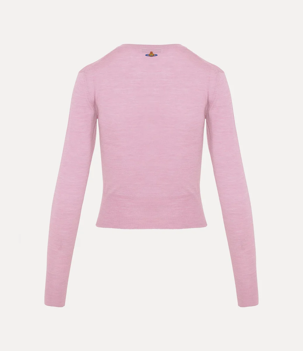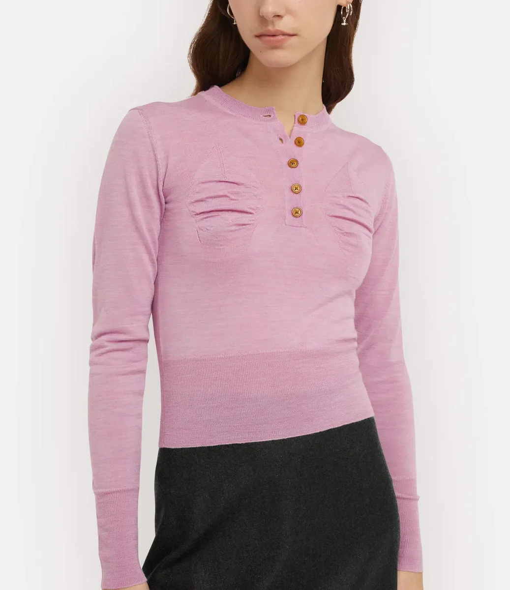 Puloverul nostru Tit are detalii sculpturale care conturează pieptul, reflectând siluetele avangardiste ale colecției „Vive la Cocotte” din toamna-iarna 1995 a lui Vivienne. Îmbogățită cu borduri cu nervuri, piesa este decorată cu un glob brodat în spate.
