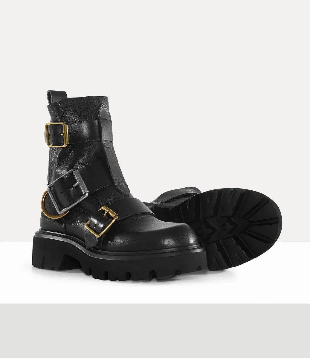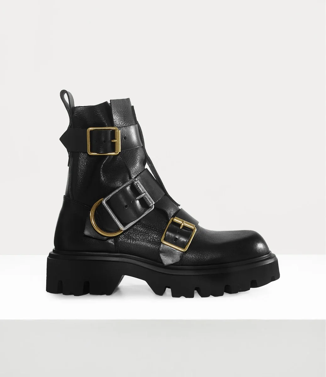 Cizmele Empire se inspiră din cizmele Rome din arhivă, introduse pentru prima dată în colecția de toamnă-iarnă 1983 a casei. Designul prezintă un finisaj din piele uleioasă, împodobit cu curele din piele cu centură și detalii cu catarame cu role, evocând teme de restricție și control inspirate de îmbrăcămintea bondage și fetish.
