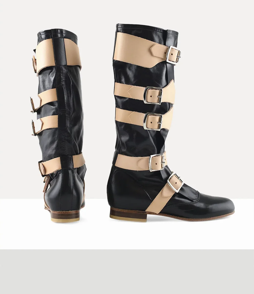 Cizmele noastre Pirate au fost prezentate pentru prima dată în colecția „Pirate” din toamna-iarna 1981, care a fost influențată de interesul Viviennei pentru poveștile aventuroase cu pirați din secolele al XVII-lea și al XVIII-lea. Designul surprinde esența romantismului și rebeliunii adesea asociate cu pirații, cu un picior învelit, moale, din piele și curele groase din piele, detaliate cu catarame cu rolă, care conferă cizmelor un aspect robust și uzat.