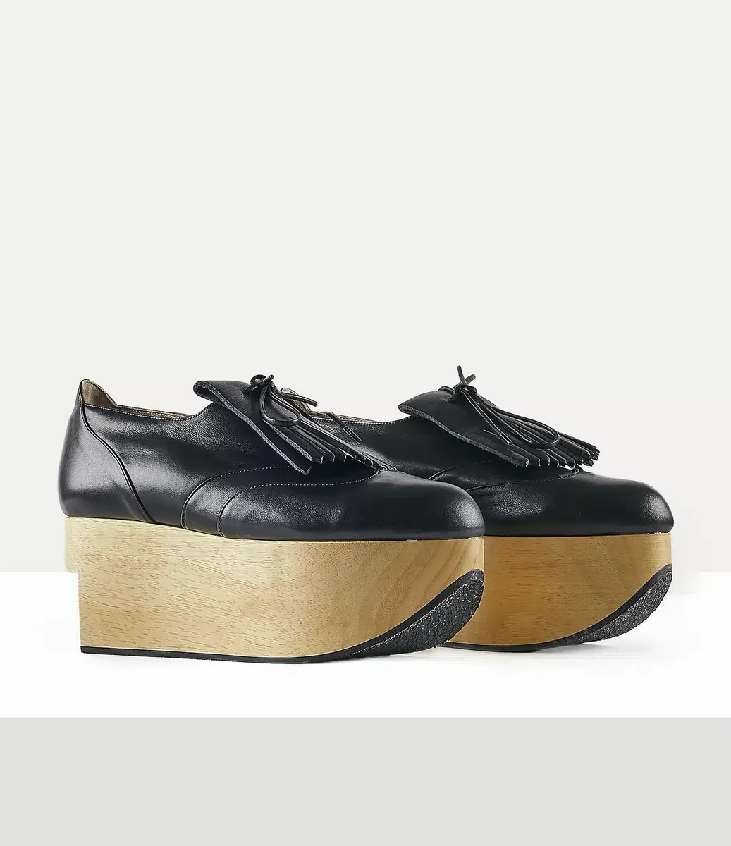 Pantofii de golf Rocking Horse sunt inspirați din încălțămintea clasică britanică de golf, având cusături decorative complexe și un detaliu distinctiv din piele care ascunde elegant șireturile. Designul este pus în valoare de tălpile contrastante din lemn, caracterizate prin partea frontală curbată și detaliul decupat caracteristic – elemente introduse pentru prima dată în colecția „Harris Tweed” din toamna-iarna 1987-88.