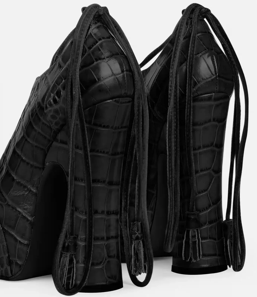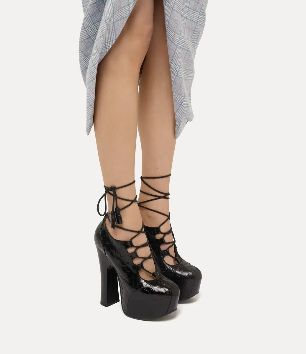 Inspirați de regalia din Highlands scoțiene, platformele noastre Ghille înalte reinterpretează clasicul ghillie brogue, oferite cu un motiv în relief cu efect de crocodil pe întreg designul. Piesa are o parte frontală scurtă și rotunjită, cu accente decupate caracteristice, completată cu șireturi lungi cu ciucuri care se înfășoară în jurul gleznei.